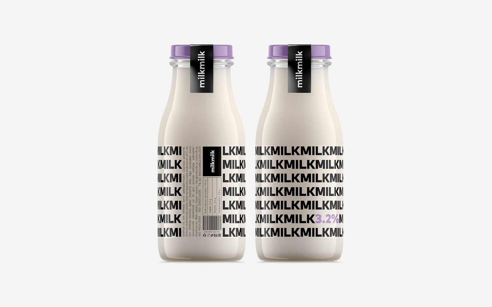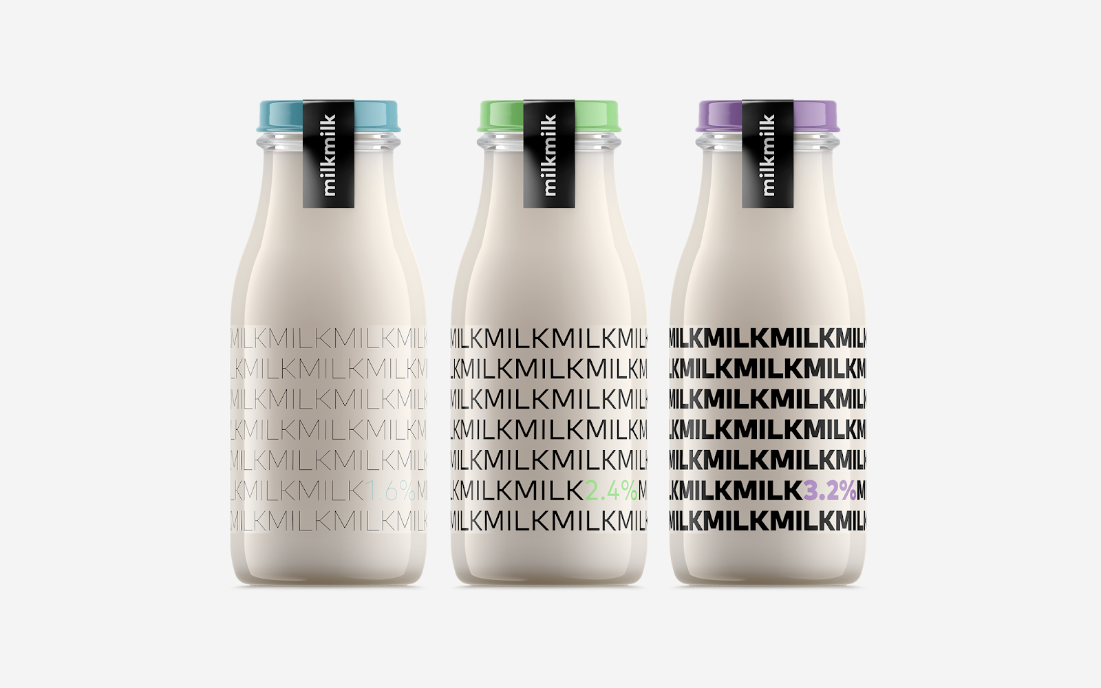 阿塞拜疆設計師Rahim Ismayil設計的牛奶包裝,設計師通過字體粗細來表現牛奶的脂肪含量。粗體字表示脂肪含量高,而細體字則表示脂肪含量低。通過瓶蓋顏色和極簡外觀讓人有一種新鮮直觀的感覺。讓人在遠處看到,想走近拿起來,進一步了解情況的沖動。